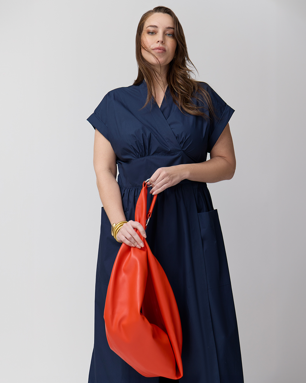 The crisp material lends itself well to the structured, tailored look of this fit and flare style piece. A shirt dress bodice highlights the waistline and helps the piece maintain its shape beautifully while emphasizing the effervescent skirt detail. Don’t worry – this material won’t let your skirt droop. A simple v-neck aligns with a break in the voluminous skirt, so this piece has all the flattering details of a wrap dress without the potential for a wardrobe malfunction. The tie back allows you to adjust the fit and add a little extra personality to your look. And it’s a Carla Rockmore dress, so of course it has pockets!